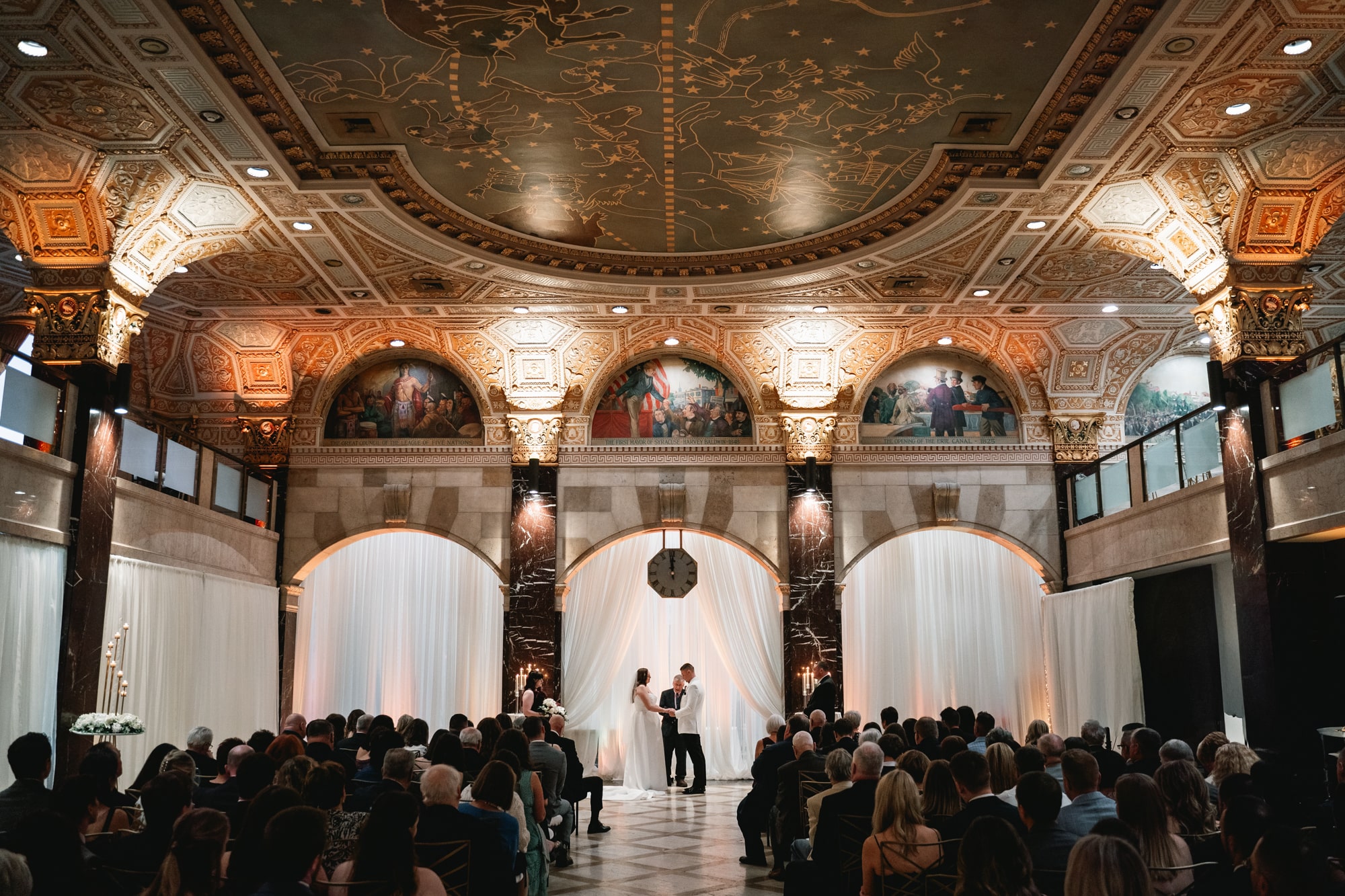 Palladian Hall is tucked right inside The Treasury building in downtown Syracuse, and it’s got some serious character. The space used to be a historic bank, and you can still feel that old-school charm in the vaulted ceilings and detailed architecture—but now it’s been totally reimagined as a wedding venue that feels both classic and fresh.